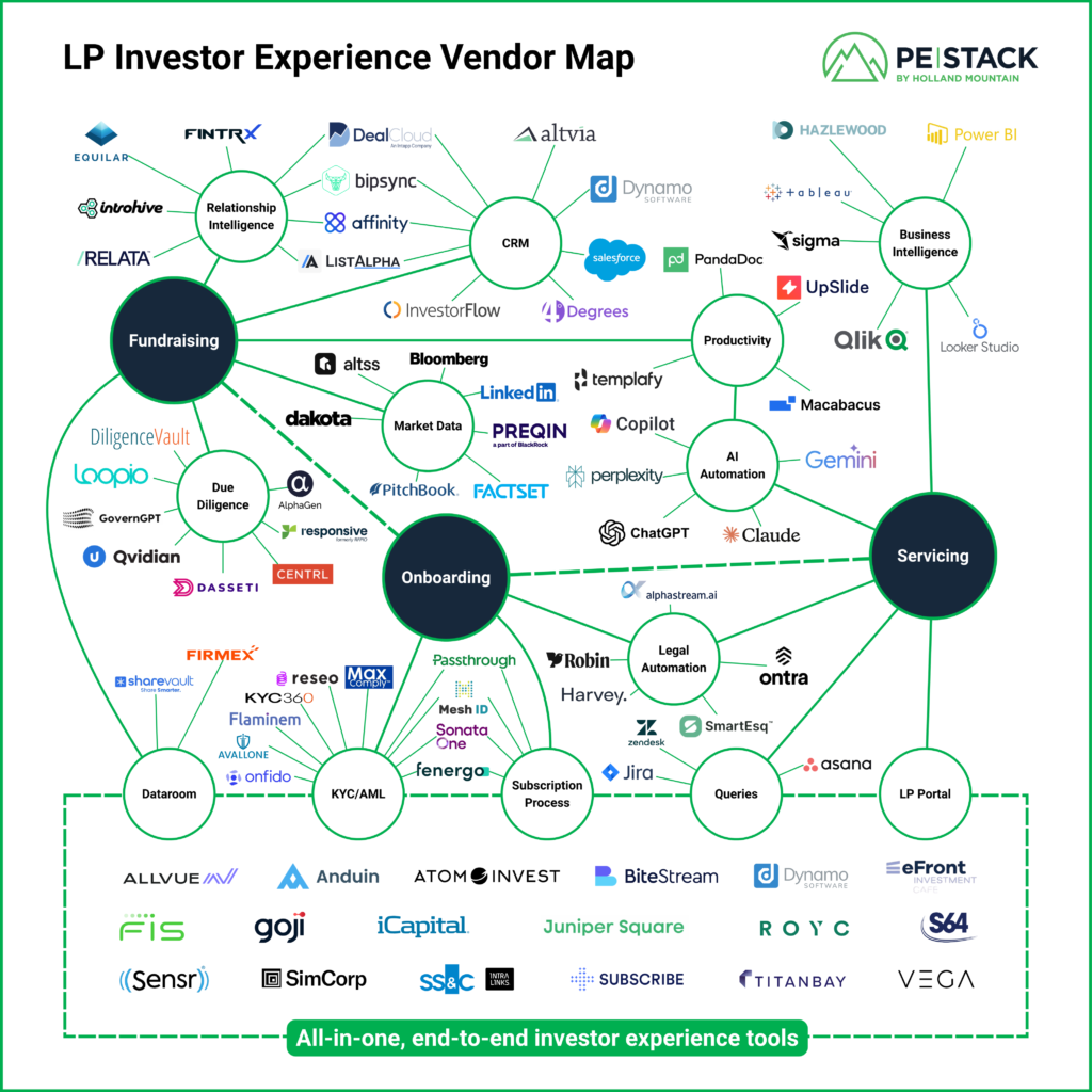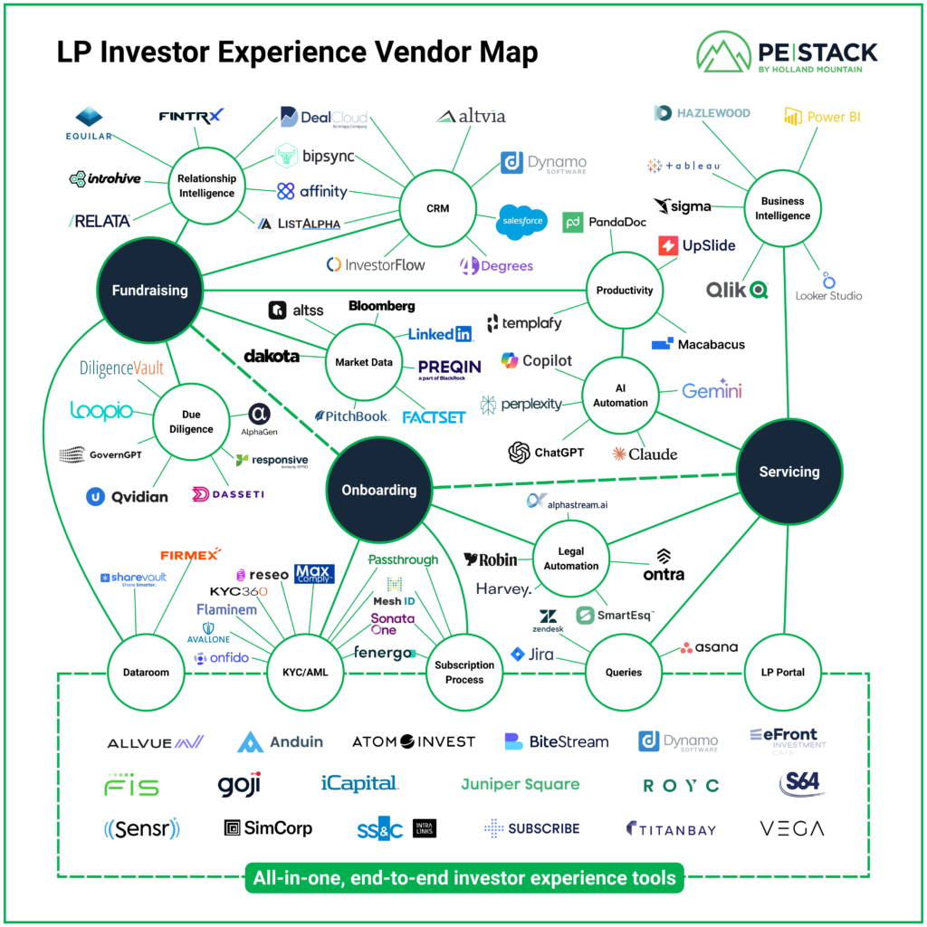 Holland Mountain’s PE Stack has created this map – featuring over 75 vendors – to show the breadth of the investor experience landscape now available to the private capital industry.