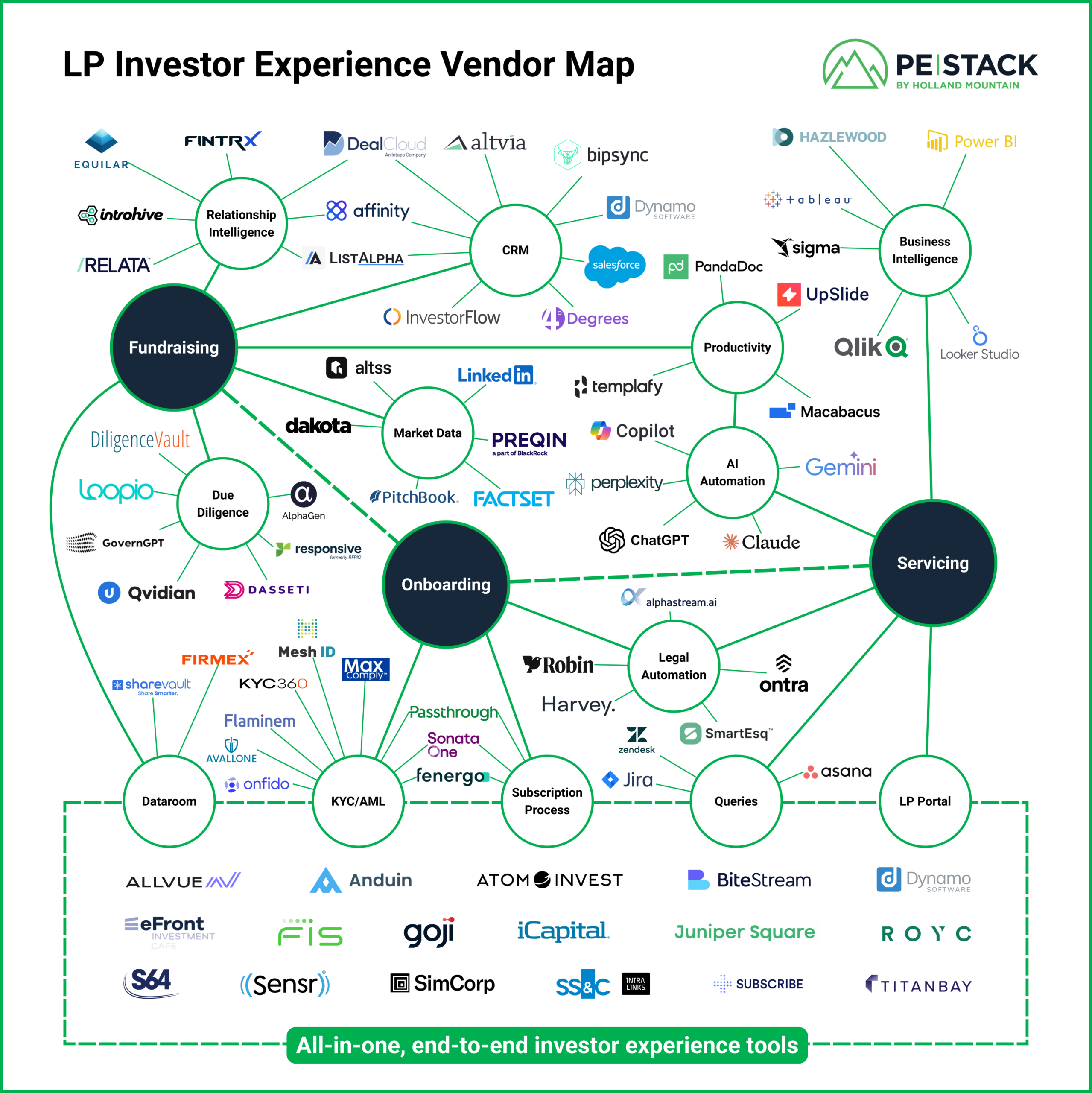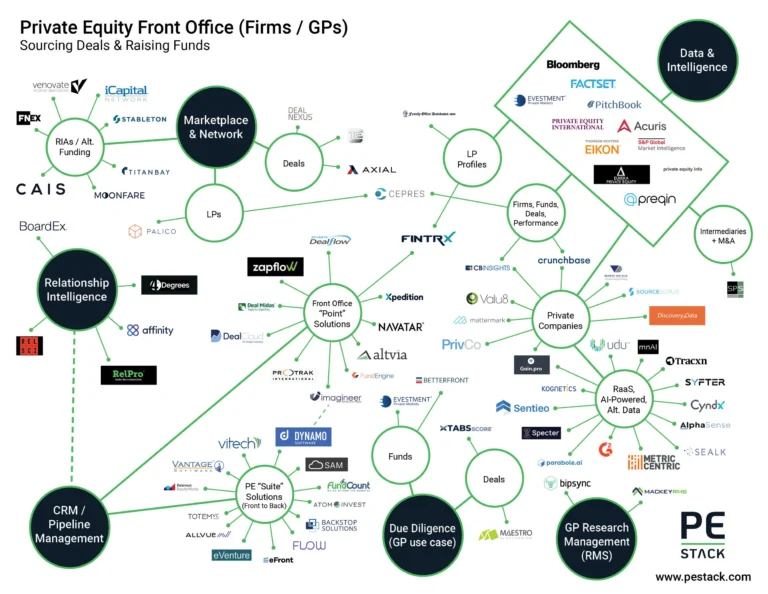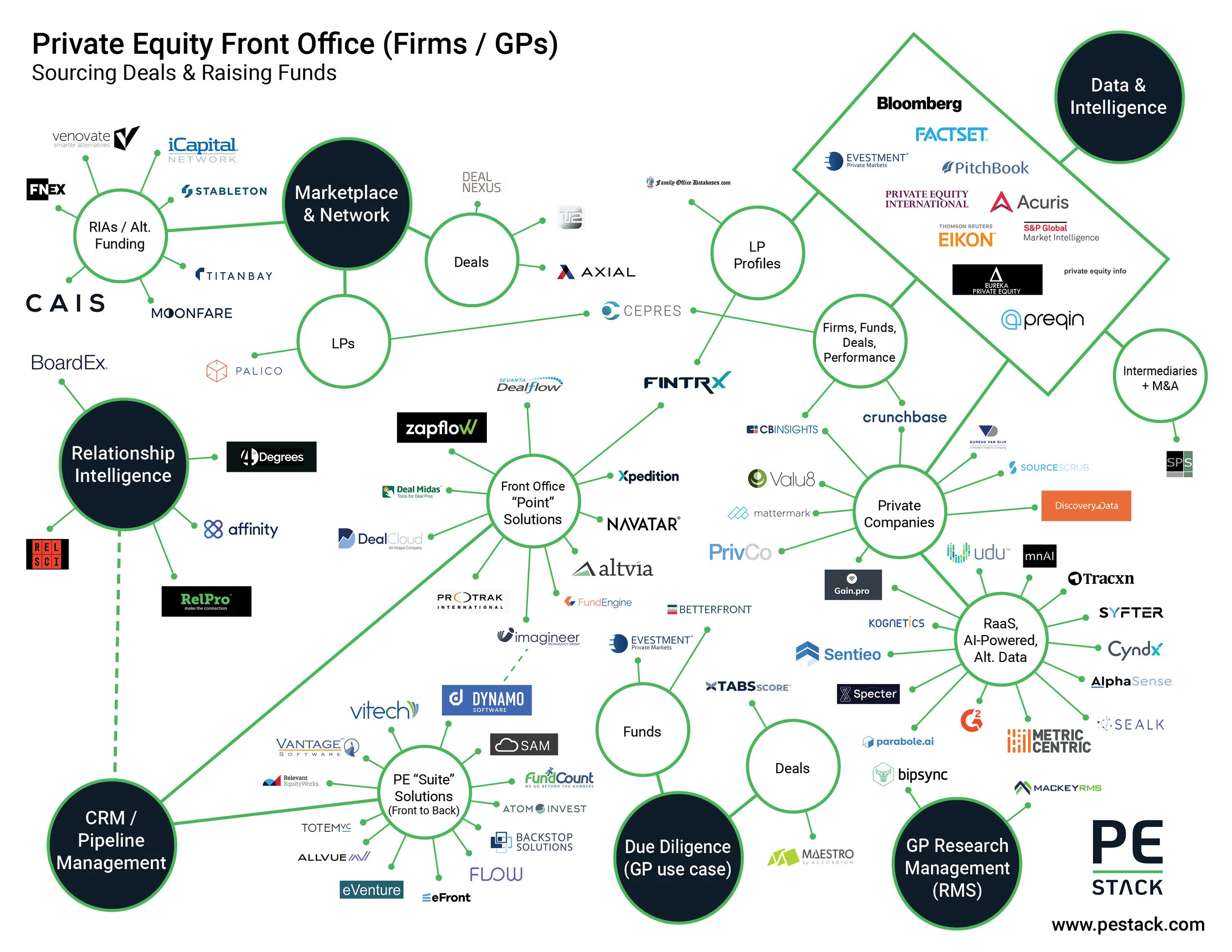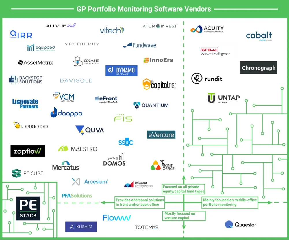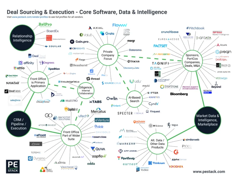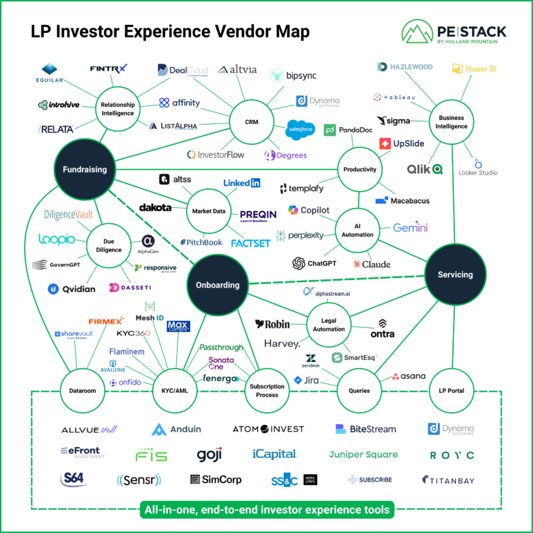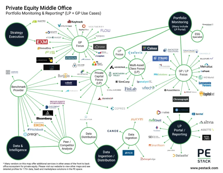 PE Stack Vendor Map Mapping the fast-growing vendor landscape for Private Capital software. Latest PE Stack MapLP Investor Experience: Key Use Cases and VendorsDownload this map in high-resolution PDF Defining use cases and relevant vendors for the fast-moving topic of Investor Experience is challenging. While we do have...Christopher VilhelmsenDecember 2, 2025 All PE stack vendor maps AI / GenAI in Private Equity: Key Use Cases and VendorsDefining use cases and relevant vendors for the fast-moving area of AI and GenAI in Private Capital represents a significant challenge. While we...Matt Guy | June 24, 2024ESG Software and Data Landscape Industry MapProducing a map that provides a meaningful overview of ESG data and software providers actively used by private equity, venture capital, and other...Tim Friedman | April 26, 2023What’s the Deal? Deal-Level Return Benchmarking – Key Buyer ConsiderationsAs new benchmarking products showing returns at the deal level hit the market, PE Stack examines the key considerations for those considering adding...Tim Friedman | August 29, 2022Deal Sourcing & Execution – Core Software, Data & IntelligenceDownload high-resolution PDF → Deal Sourcing & Execution As the private equity and venture capital product universe expands, so does the challenge of...Tim Friedman | August 3, 2022GP Portfolio Monitoring Market MapGP portfolio monitoring strategy and selection is a very common project for PE Stack, with adoption driven by both the increasing data demands...Tim Friedman | February 23, 2022Private Equity Back Office Solutions Map – Fund Administration Technology, Waterfall Calculation, Subscription and OnboardingDownload high-resolution PDF → Vendor Reputation, Third Party Administrators and the Perception of Risk Unlike other areas covered by PE Stack, the back...Tim Friedman | January 18, 2021Private Equity Middle Office Solutions Map – Portfolio Monitoring, LP Reporting, and DataPrivate Equity Portfolio Management Excel’s reign as the king of middle office has finally come to an end. The explosive growth of the...Tim Friedman | October 19, 2020Private Equity Front Office Solutions Map – Sourcing Deals and Raising FundsImproving Front Office Operations Many GPs want to improve the efficiency and effectiveness of their front office operations and maintain good oversight of...Tim Friedman | September 22, 2020