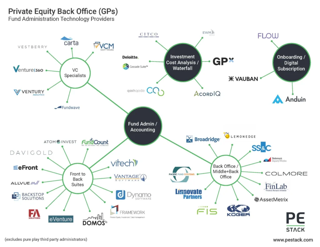 Unlike other areas covered by PE Stack, the back office is often outsourced to third party administrators, many of which will use some of the platforms outlined in our map to deliver services to their clients. FIS Private Equity Suite (formerly known as Investran), eFront and Allvue (encompassing the company formerly known as AltaReturn) are all prominent names for outsourced service providers.